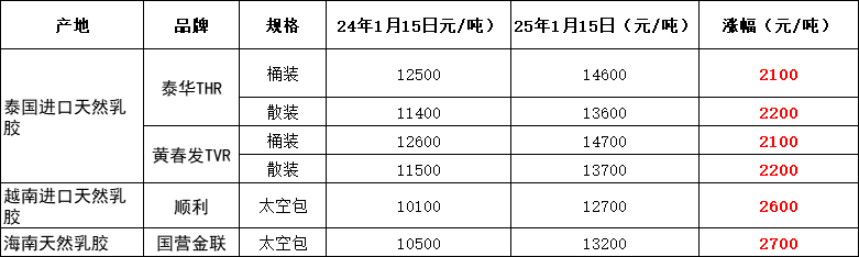 距离农历春节还有差不多两个星期的时间,还是照旧回顾一下历年春节前的行情。记得以往春节前,由于市场冷清,价格多少会降一点,但是自从24年春节前开始,一反常态,节前不仅降价,反而还涨价。24年春节是2月初,我们先对比一下今年和去年同期天然乳胶的价格: