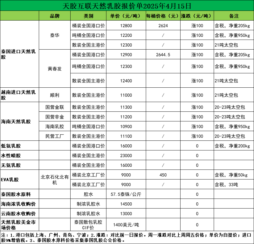 每吨涨价100元!天然乳胶现货价格(2025.04.15)
