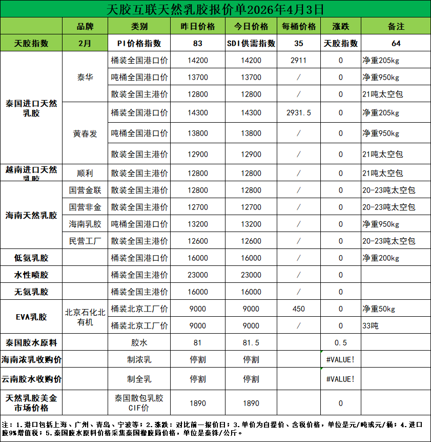 涨跌不大!天然乳胶现货价格(2026.04.03)