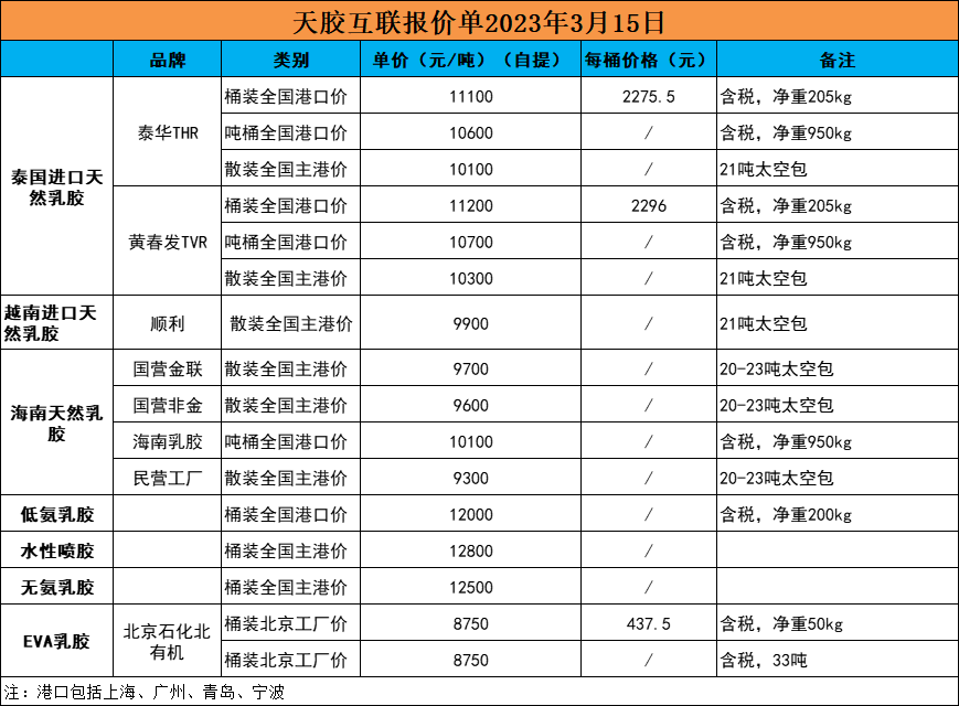 国产乳胶低至9300元/吨!天然乳胶现货价格(2023.3.15)