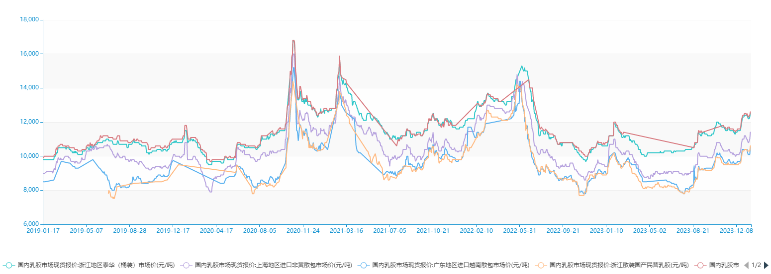 橡胶期货13800附近震荡,天然乳胶现货比较稳定:泰华THR桶装12500元/吨,黄春发桶装12600元/吨;泰华THR散装(太空包)11400元/吨,黄春发散装(太空包)11500元/吨。1月16日泰国胶水原料价格达60泰铢/公斤,这是继2022年6月中旬泰国胶水原料价格跌破60泰铢/公斤后,时隔差不多18个月,也就是一年半的时间,泰国胶水原料价格再次涨到这个价格。2022年3月份的时候,泰国胶水原料价格一度涨至70泰铢/公斤,随后在60泰铢/公斤到70泰铢/公斤之间,一直持续到2022年6月中旬,泰国胶水原料价格下跌,随后到2022年8月跌破50泰铢/公斤,持续在50泰铢/公斤下方震荡。2023年2、3月份价格短暂涨到50泰铢/公斤上方又跌了下来,2023年10月份再度上涨到50泰铢/公斤以上,随后持续上涨,直到2024年1月中旬涨到60泰铢/公斤。涨到这个价格意味着什么呢?我们可以对比以前价格。近几年有三段时期,泰国胶水原料价格在60泰铢/公斤以上,分别是2020年10月份到11月份,2021年2月下旬到5月底,2022年2月中旬至6月份上旬。而这三段时期,天然乳胶的价格详情如下(我们以天胶集团旗下天胶互联的报价为准):通过这个对比,你就很容易看出来,泰国胶水原料价格超过60泰铢/公斤之后,泰国进口乳胶桶装的价格是高于13000元/吨,散装高于12300元/吨,越南进口乳胶高于11000元/吨,国产乳胶也是高于11000元/吨的。如果按照过往的经验来看,泰国胶水原料价格继续上涨的,天然乳胶价格大概率也会继续波动。那么,对比一下当前价格,泰国进口乳胶桶装、散装可能还有涨幅500元/吨左右涨幅,越南进口乳胶涨幅500-1000元/吨之间,国产乳胶大概也有500元/吨左右吧。这个只是基于当前价格和过往经验的预计。总的来说,胶水原料价格和天然乳胶价格呈现是一种正相关的走势。原料价格对天然乳胶价格存在较强支撑。以上纯属个人分析,不构成投资建议,投资者据此投资,投资风险自我承担。