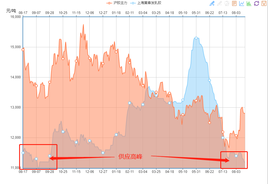 橡胶期货主力合约已经从2209切换到2301,行情止跌反弹,反弹至12900附近。天然乳胶现货价格继续下跌,泰国进口乳胶散装跌破一万,桶装跌破一万一大关,刚需采购部分现货报价参考:泰华THR桶装10900元/吨,黄春发桶装11000元/吨;泰华THR散装(太空包)9700元/吨,黄春发散装(太空包)9800元/吨。当前天然乳胶现货价格还在下跌,我们此前已经说了天然乳胶现货价格将在三季度达到全年低价位置。因为全年供应高峰期到来,供应高峰期的时候,价格也将是全年较低水平,往年均是如此。