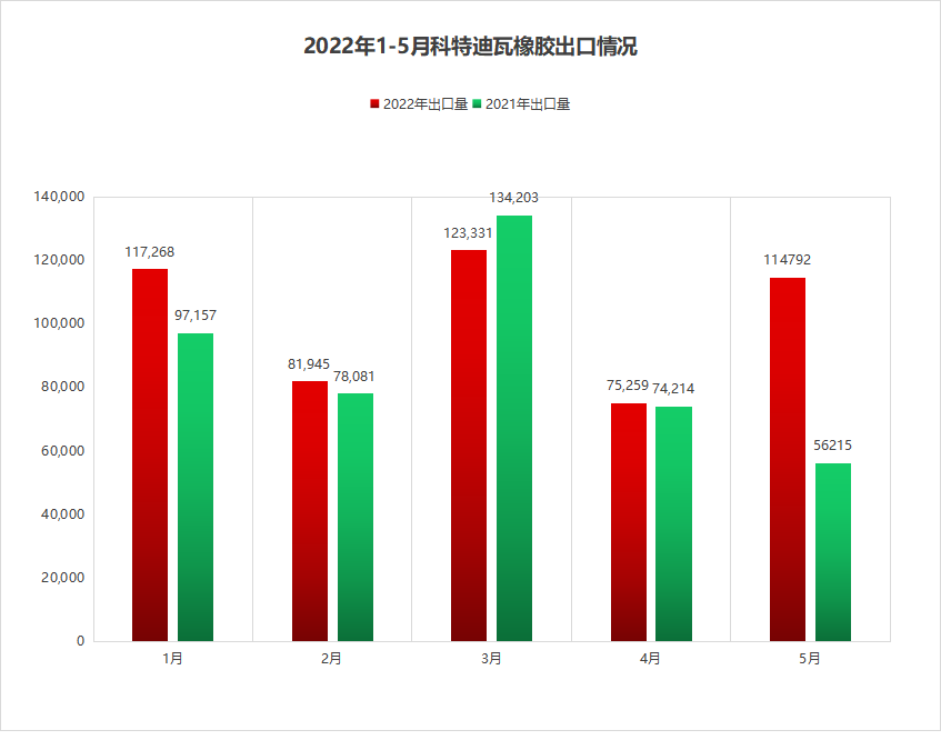 2022年5月,科特迪瓦橡胶出口量114792万吨,环比上个月增长53%,同比去年增长200%。2022年1-5月科特迪瓦橡胶出口量合计512,595吨,较2021年同期的439,870吨增加16.5%。
