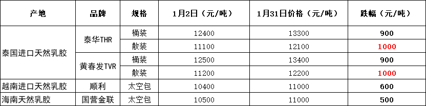 1月份涨幅较大的是泰国进口乳胶,桶装涨幅1000元/吨,散装涨幅900元/吨。越南进口乳胶和国产乳胶的涨幅反而不如泰国进口乳胶,涨幅在500元/吨到600元/吨。也就是1月份整个趋势就是涨价。