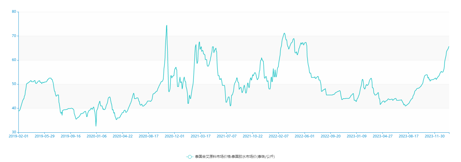 1月份之所以涨这么多,主要因素在于供应端,在于成本驱动。1月份国内停割了,供应处于下降之中,所以只能看泰国了。而2023年12月底,泰国洪灾影响了当地南部产区,也就是乳胶主要供应地的割胶和产能,以至于泰国胶水原料价格不断上涨。
