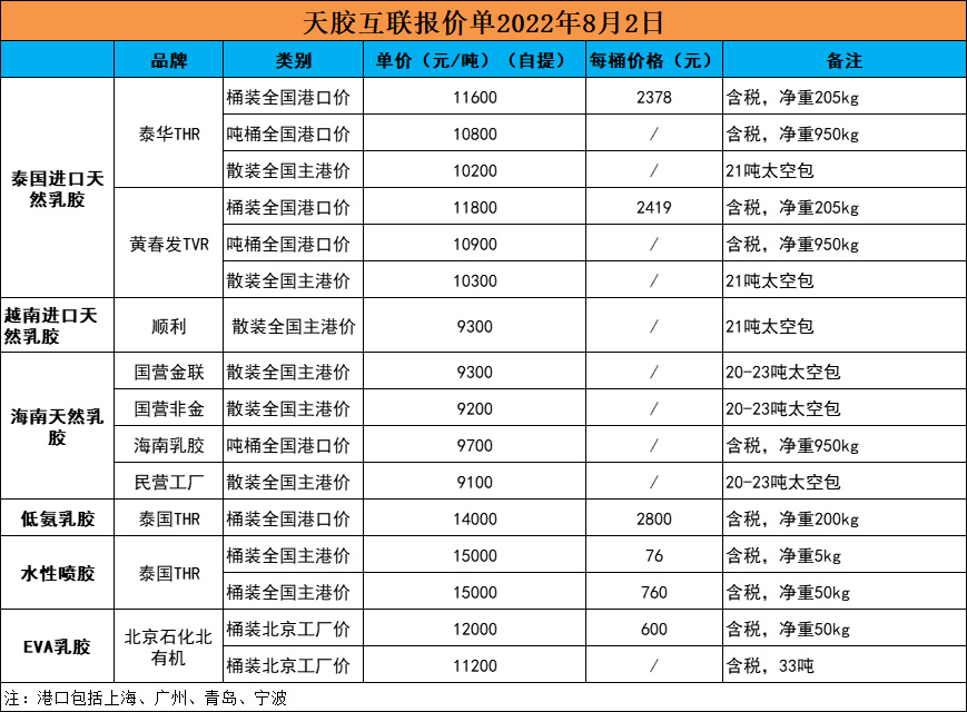 泰国进口乳胶黄春发2419元/桶!天然乳胶现货价格(2022.8.2)