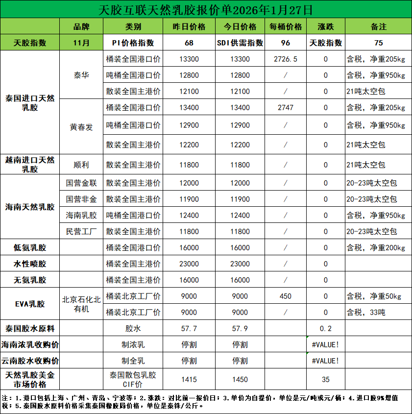 暂无变化!天然乳胶现货价格(2026.01.27)