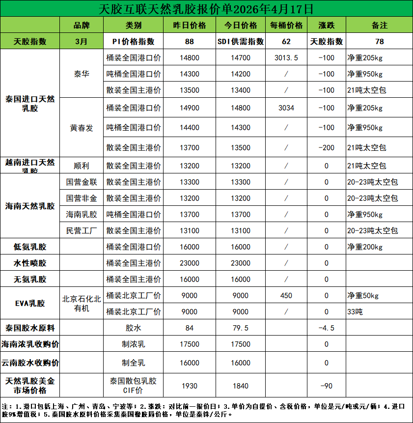泰国胶降价100元/吨!天然乳胶现货价格(2026.04.17)