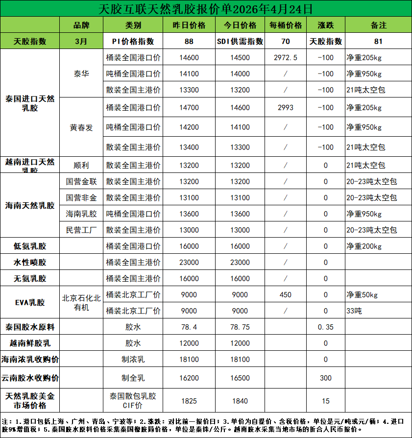 每吨降价100元!天然乳胶现货价格(2026.04.24)