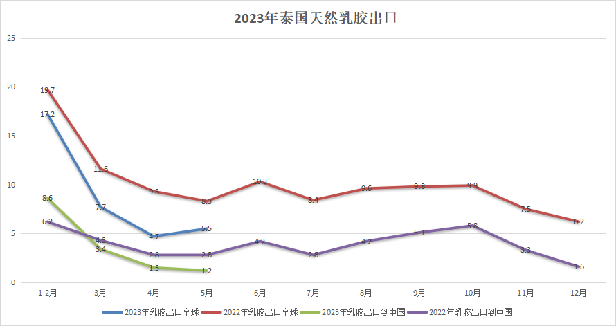 橡胶期货本周在一万二下方震荡,目前在11900附近震荡,业内人士预计橡胶期货还有下跌的可能性。国内天然乳胶市场一般,天然乳胶价格变化不大,部分产品价格下降,现货报价:泰华THR桶装10200元/吨,黄春发桶装10300元/吨;泰华THR散装(太空包)8900元/吨,黄春发散装(太空包)9000元/吨。6月25日,泰国橡胶局表示2023年橡胶有向好的趋势,因为今年的橡胶产量会下降,而橡胶消费量预计为1556.3万吨,较去年增长5%。他们还表示“今年橡胶供应有限,原因是今年全国范围内天气炎热且干旱、雨水也是断断续续,橡胶种植主产区南部地区持续降雨,导致橡胶的产量不高,所以橡胶的价格可能会上调。”其实,泰国今年一直在唱多橡胶,他们唱多橡胶无非是急了,看看数据就知道了。2023年5月,泰国出口天然橡胶(不含复合橡胶)20.3万吨,环比小幅上涨。今年前5个月合计为111.3万吨,同比降22%。其中,标胶合计出口60万吨,同比降16%;烟片胶出口15.3万吨,同比降25%;乳胶出口35.1万吨,同比降28%。2023年5月出口到中国天然橡胶为7.1万吨,今年前5个月合计为45万吨,同比增3%。其中,标胶出口到中国合计为27万吨,同比增13%;烟片胶出口到中国合计为3.3万吨,同比增43%;乳胶出口到中国合计为14.7万吨,同比降9%。从数据可以得知,今年前5个月泰国天然乳胶出口同比大幅下降28%,出口到中国同比下降9%。其中,5月份出口5.5万吨,出口到中国1.2万吨。5月份天然乳胶美金市场平均价格在1050美元。如果按照这个价格来算,泰国5月份出口收入5775万美元,相比去年的收入而言是大幅下降。今年泰商天然乳胶出口量和出口价格都大幅下降,意味着泰国今年天然乳胶收入下降。逻辑已经很清晰,我们就不难理解为什么泰国橡胶局为啥一直在唱多橡胶。作为全球主要天然橡胶供应商,橡胶是他们外汇主要来源之一,现在出口量和价格下降导致他们外汇收入下降太厉害,压力很大,所以不得不唱多来加大出口和提升价格以确保收入。以上纯属个人分析,不构成投资建议,投资者据此投资,投资风险自我承担。