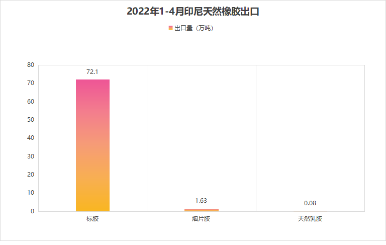 2022年前4个月,印尼出口天然橡胶(不含复合橡胶)合计为74万吨,同比降14.1%。其中,标胶合计出口72.1万吨,同比降14%;烟片胶出口1.63万吨,同比降18%;乳胶出口0.08万吨,同比增1.3%。