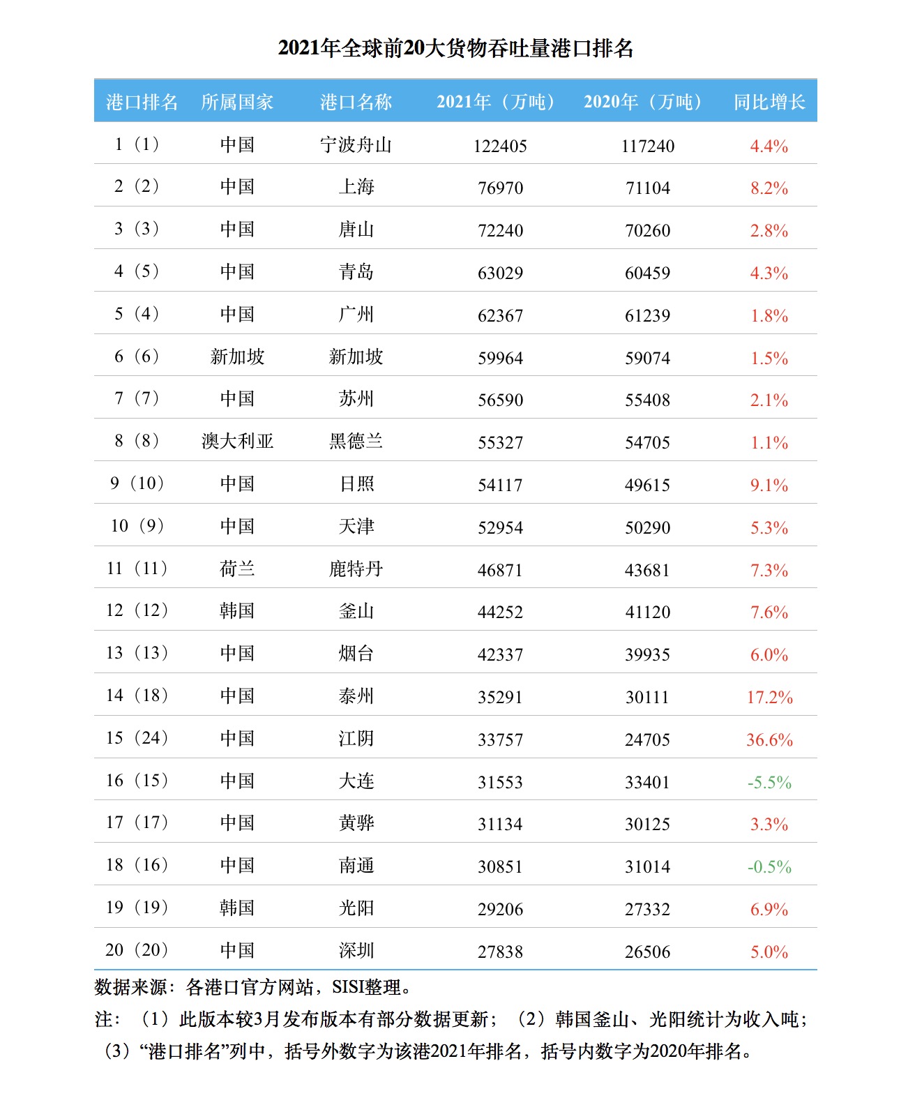 2021年全球前20大港口有10港排名发生变动,青岛港、日照港分别以4.3%和9.1%的增速超越广州港、天津港,实现排名互换;日照港2022年有望继续赶超澳大利亚的黑德兰港,跻身全球第8位。以下是2021年全球前20大货物吞吐量港口排名: