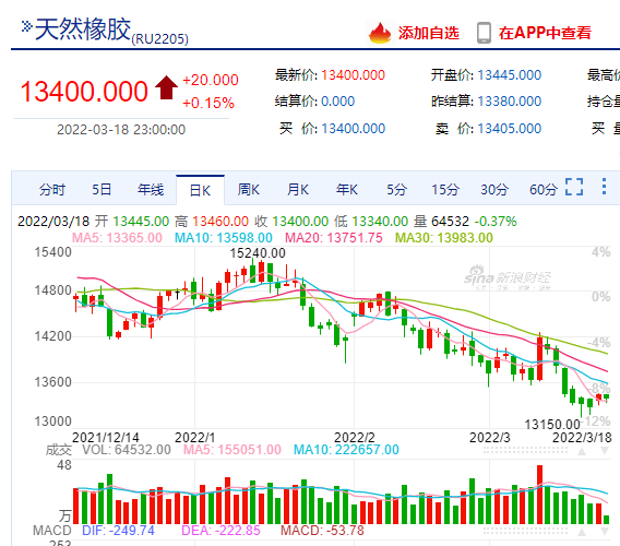 1、本周橡胶期货大幅下跌。(橡胶RU2205合约:13400)。