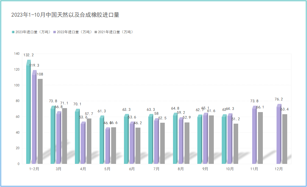 据中国海关总署11月7日公布的数据显示,2023年10月中国进口天然及合成橡胶(含胶乳)合计63万吨,较2022年同期的64.3万吨下降2%。今年1-10月共计654.4万吨,较2022年同期的586.1万吨增加11.7%。