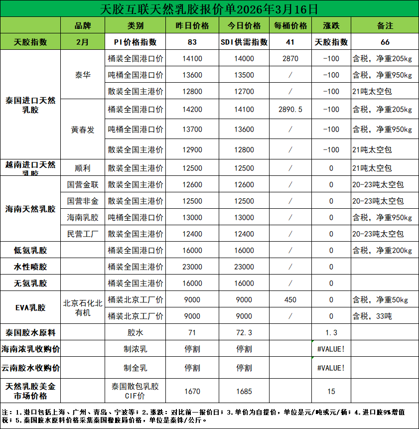 涨跌不大!天然乳胶现货价格(2026.03.16)