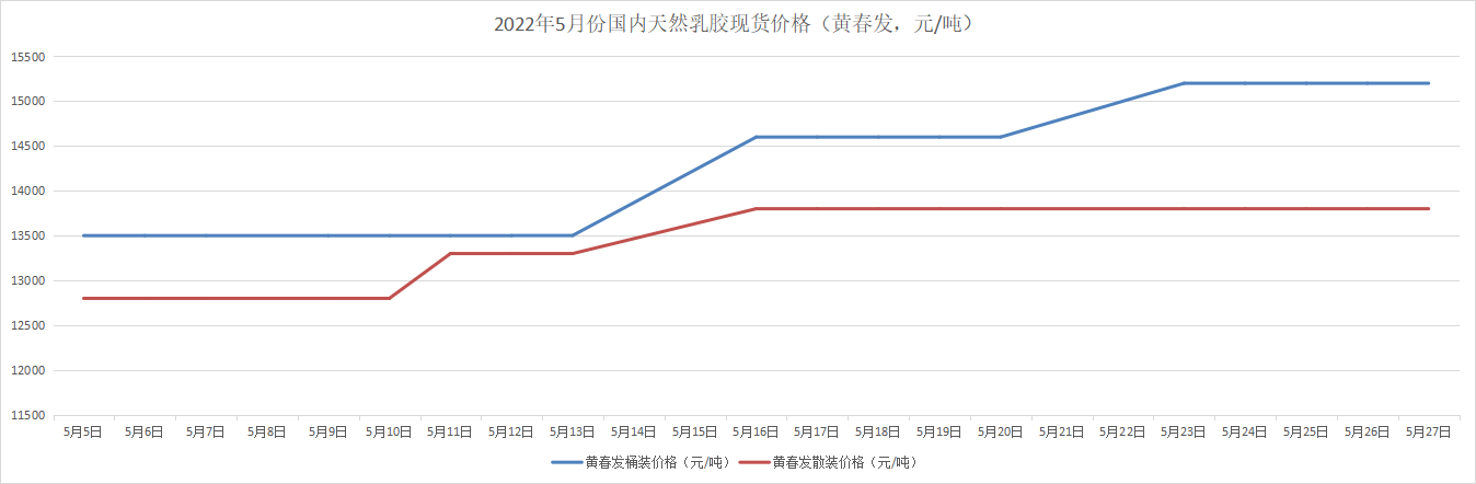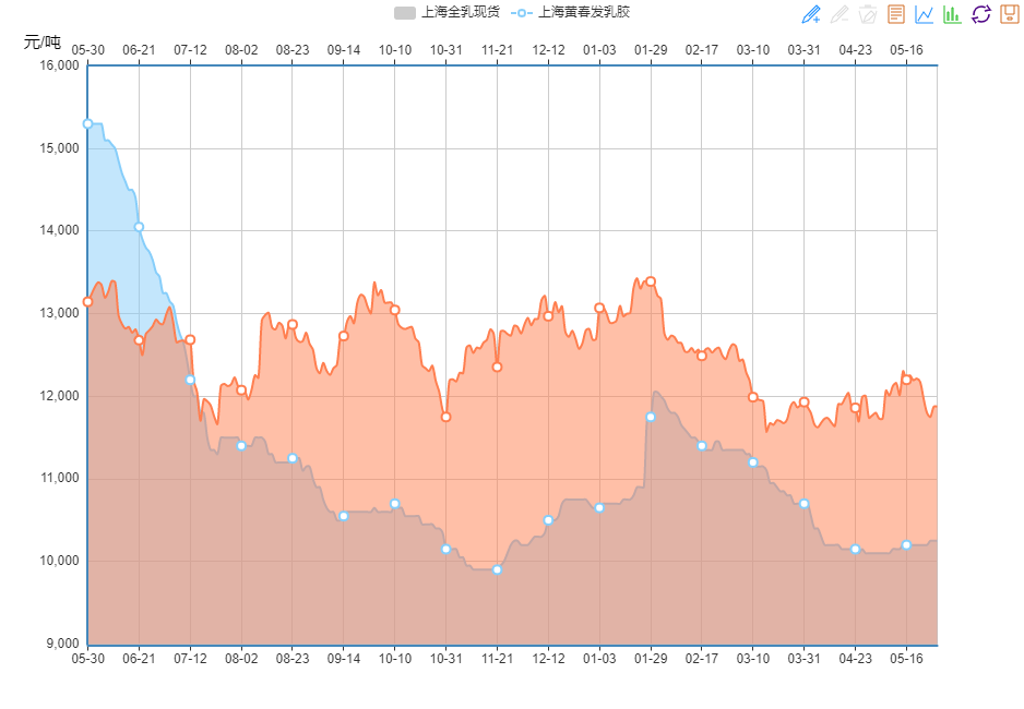 可以发现今年5月份天然乳胶的价格和去年同期相比简直就是天差地别。去年此时,价格不断上涨,不断创新高,高位的时候高达15500元/吨,比今年的价格高了5000元/吨左右,一年的时间,价格居然波动这么大,行情也是冰火两重天。