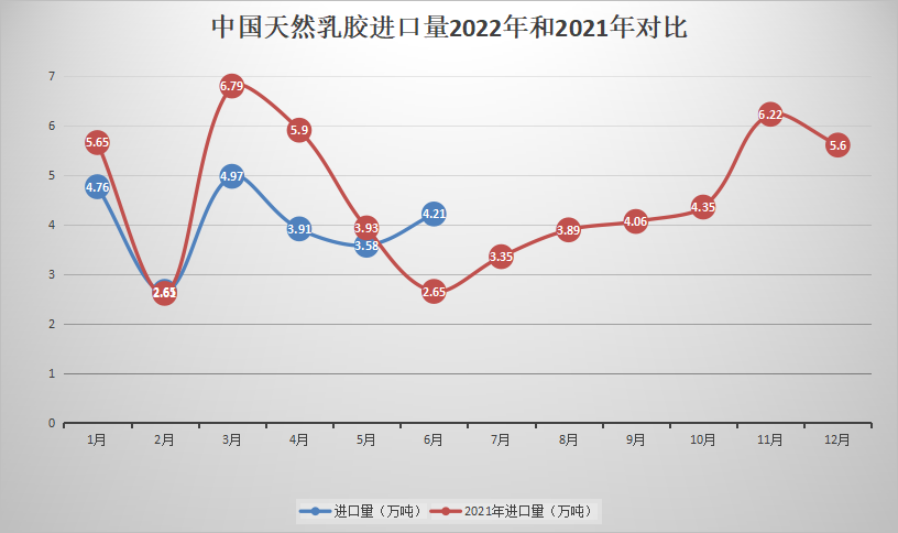 根据隆众的数据统计,2022年6月中国进口天然乳胶预估为4.21万吨,如果数据与实际相差不大的话,那么,环比涨长17.6%,同比增加1.56万吨,大幅增长58.94%。1-6月累计进口量24.08万吨,累计同比下跌12.34%。