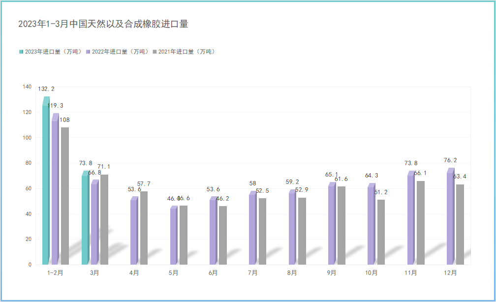 据中国海关总署4月13日公布的数据显示,2023年3月中国进口天然及合成橡胶(含胶乳)合计73.8万吨,较2022年同期的66.8万吨增加10.5%。