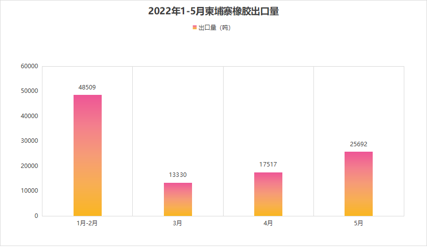 据柬埔寨橡胶总局报告显示,2022年5月柬埔寨出口橡胶25692吨,2022年1-5月柬埔寨共出口橡胶达105048吨,同比去年增长3%。