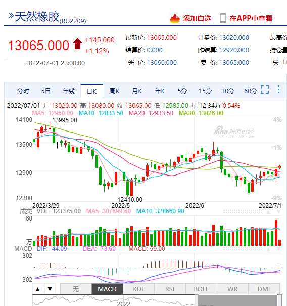 1、本周橡胶期货上涨突破13000。(橡胶RU2209合约:13065)
