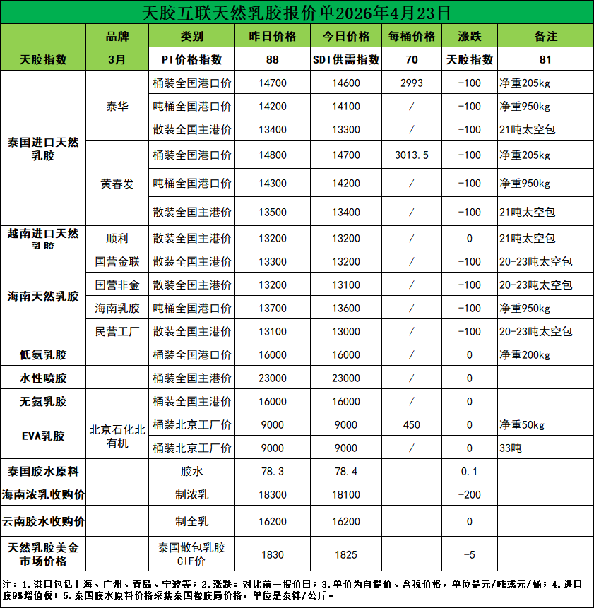 每吨降价100元!天然乳胶现货价格(2026.04.23)