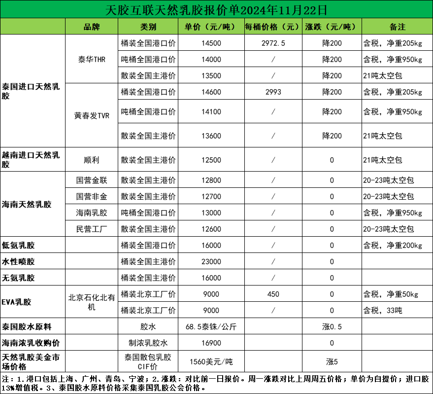 泰国胶每吨降200元!天然乳胶现货价格(2024.11.22)