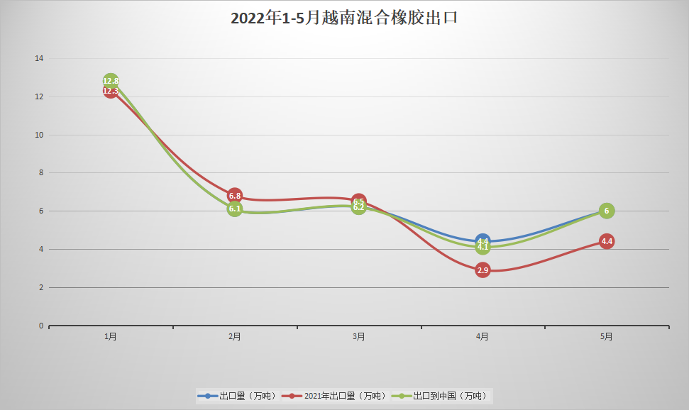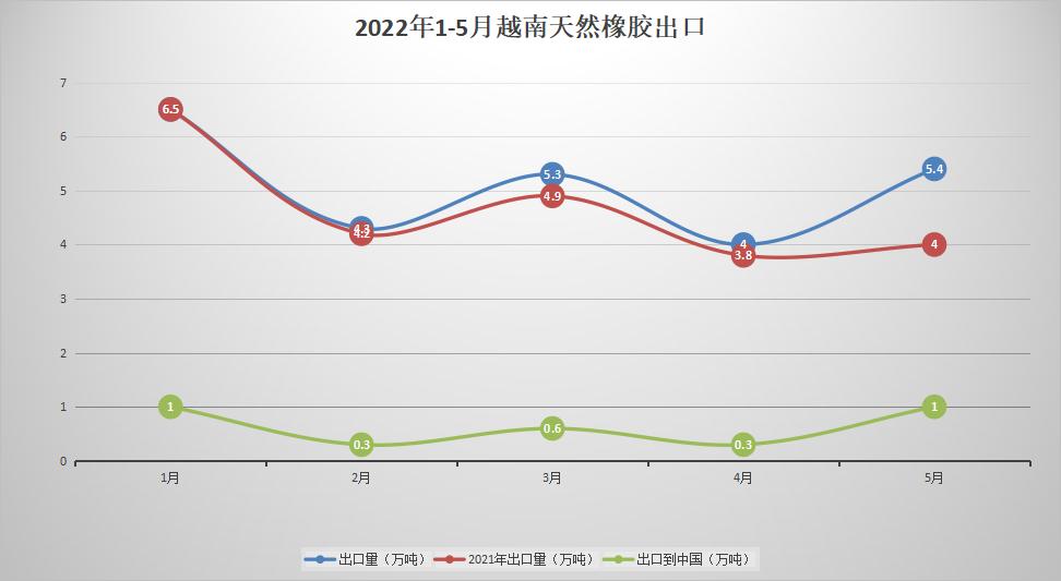 2022年5月,越南天然橡胶出口到中国1万吨,同比增长。2022年1-5月,越南天然橡胶出口到中国合计3.2万吨,较去年的3.3万吨同比下降3%。