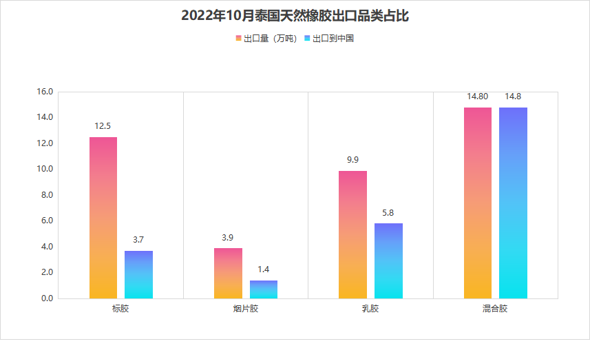 2022年10月,泰国出口到中国天然橡胶为10.9万吨。其中,标胶出口到中国为3.7万吨,烟片胶出口到中国为1.4万吨,乳胶出口到中国为5.8万吨。