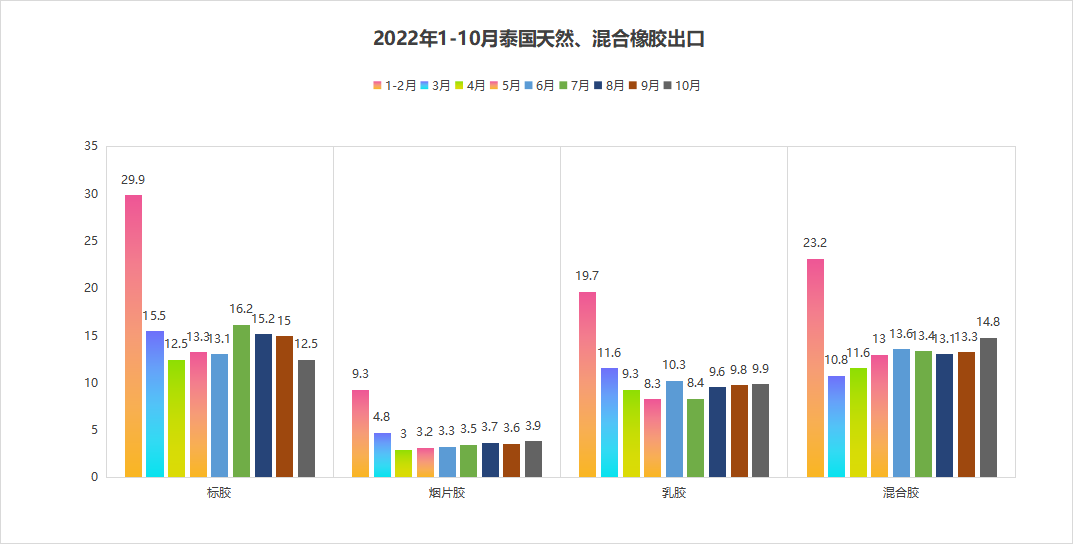 2022年10月,泰国出口混合胶为14.8万吨,出口到中国14.8万吨。2022年1-10月,泰国出口混合胶合计为126.8万吨,同比增29%;混合胶出口到中国合计为125.7万吨,同比增28%。