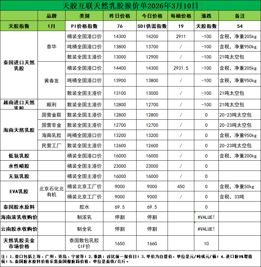 每吨降价100元!天然乳胶现货价格(2026.03.10)