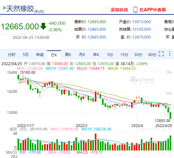 橡胶主力RU2209收盘,一日内下跌400多点,白天低价12655,目前跌破12700,跌至12665,继续创新低!