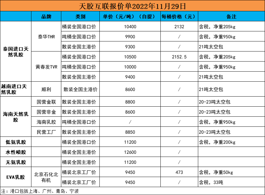 泰国进口乳胶涨至10500元/吨!天然乳胶现货价格(2022.11.29)