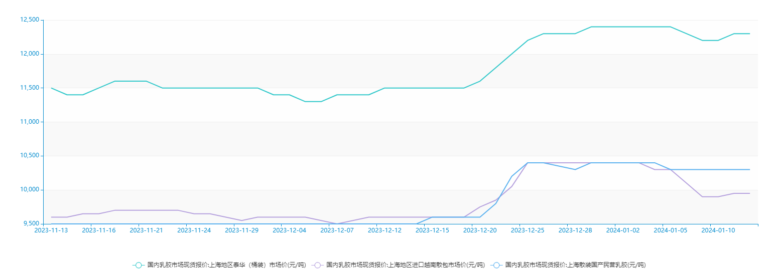 总的来说,随着春节临近,市场将会越来越淡,胶水原料供应减少,步入全年低位期间。国内需求也会在春节假期来临前后进入到全年低位时段。胶水价格高位,现货市场货源偏紧,库存下降,价格只能是易涨难跌。如果春节后需求起来,或者说市场普遍认为春节前后有涨价预期,都会助推价格上涨。