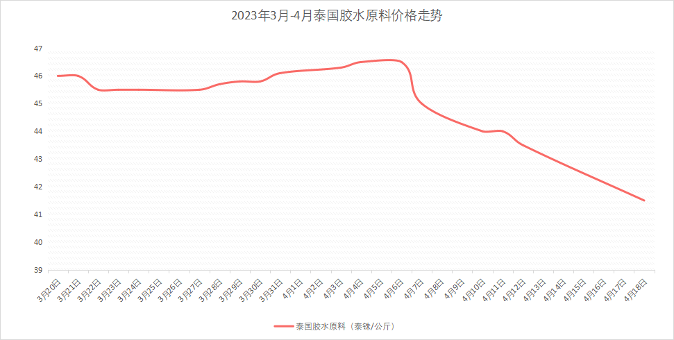 泰国宋干节已经结束,说明泰国已经逐步向量产季节渡。果不其然,宋干节后泰国胶水原料价格跌了2泰铢,报价41.5泰铢/公斤。泰国胶水原料价格下跌反映出下游需求依然没有太多的改善。
