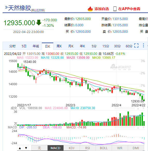 1、本周橡胶期货大幅下跌。(橡胶RU2209合约:12935)。