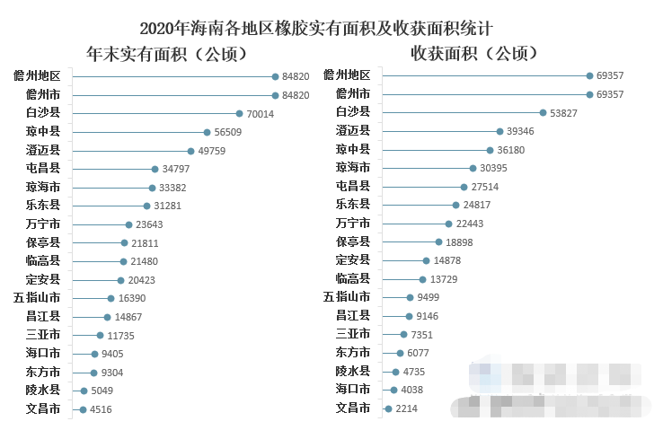橡胶期货在12000附近震荡。本周天然乳胶现货价格相对稳定,涨跌幅度都不大,刚需采购部分现货报价参考:泰华THR桶装11600元/吨,黄春发桶装11800元/吨;泰华THR散装(太空包)10100元/吨,黄春发散装(太空包)10200元/吨。据“三亚发布”公众号的消息,8月4日12—24时,三亚市新增74例确诊病例、33例无症状感染者。8月1日0时至8月4日24时,累计发现确诊病例146例、无症状感染者34例。也就是说三亚疫情出现反弹,防疫政策已经升级。根据《三亚日报》的消息,2022年8月4日零时起,我市(除海棠湾区域、亚龙湾区域、育才生态区外)进入区域管控状态,企事业单位、公共场所、社区(村、居)等凭24小时内核酸阴性证明或当日核酸采样记录(须有前1天阴性记录)出入。已划定的高风险区封控措施不变,即人员“足不出户,上门服务”。原则上每个社区(村、居)只保留1-2个出入口,实行24小时值守,人员非必要停止进出,参加核酸检测采样即出即回。居民每2天凭出入证可出门购买物资1次,或通过线上订购生活物资。海南全岛都可以种植橡胶树,所以分布比较均匀。从下图就可以看出来,海南全岛全部几乎都分布种植有橡胶树。但从收获来看,主要集中在东部和中东部,截止2020年末儋州地区橡胶实有面积为84820公顷,其中收获面积为69357公顷,全省排名第1;白沙县橡胶实有面积为70014公顷,其中收获面积为53827公顷,全省排名第2;琼中县橡胶实有面积为56509公顷,其中收获面积为39346,全省排名第3。三亚无论是种植面积和收获面积均不高。