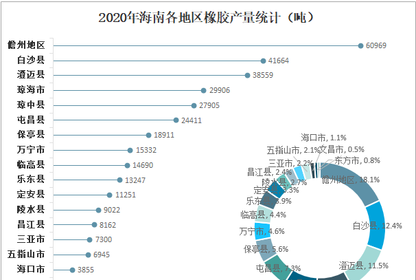 就算从实际的产量来看,我们以2020年数据为例子,儋州地区橡胶产量完成60969吨,占全省橡胶总产量的18.1%,全省排名第1;白沙县橡胶产量完成41664吨,占全省橡胶总产量的12.4%,全省排名第2;澄迈县橡胶产量完成38559吨,占全省橡胶总产量的11.5%,全省排名第3。三亚才几千吨而已。
