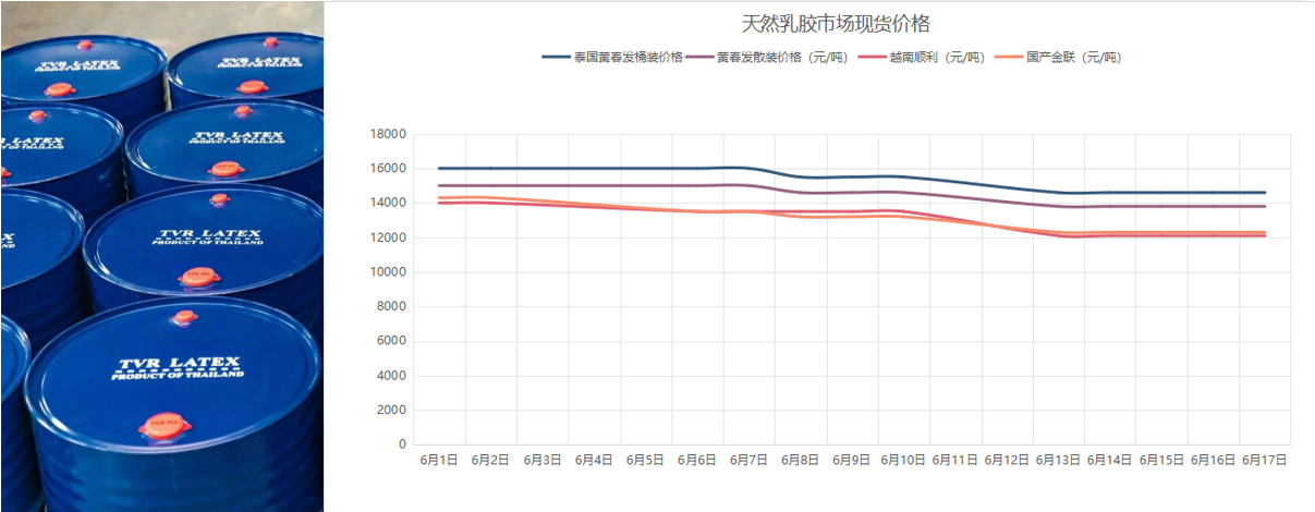 截止到2022年6月17日(周五)泰华THR桶装14600元/吨,黄春发桶装14500元/吨;泰华THR散装(太空包)13800元/吨,黄春发散装(太空包)13700元/吨。越南进口乳胶报价12100/吨,国产乳胶12300元/吨。