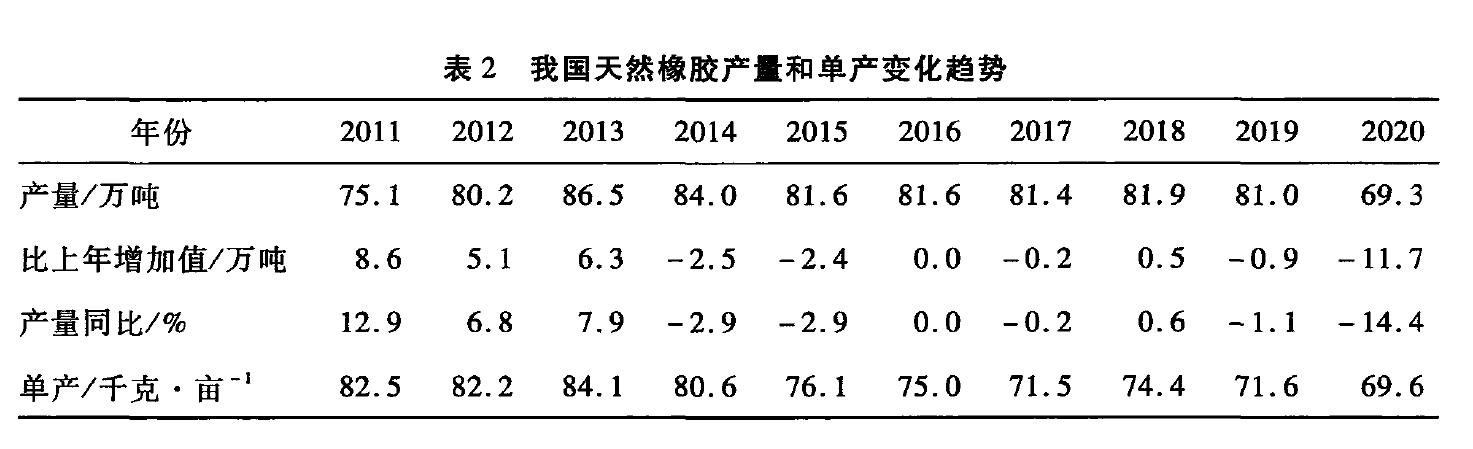 2020年,受新冠疫情、开割期推迟及病虫害严重等因素影响,全国天然橡胶产量约为69.3万吨,比2019年的81万吨下降14.4%。全国天然橡胶平均单产不足70千克/亩,同比下降9.8%。