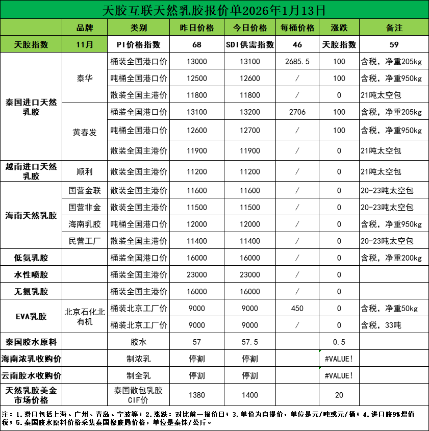 涨跌不大!天然乳胶现货价格(2026.01.13)