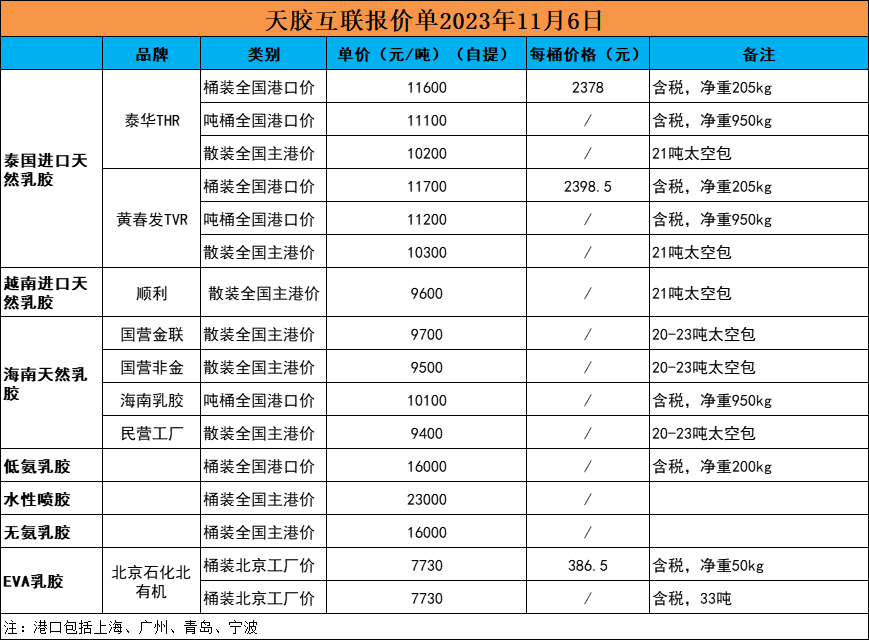 国产乳胶9400元/吨!天然乳胶现货价格(2023.11.6)