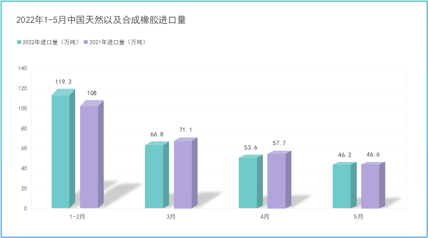 据中国海关总署6月9日公布的数据显示,2022年5月中国进口天然及合成橡胶(含胶乳)合计46.3万吨,较2021年同期的46.6万吨微降0.6%。