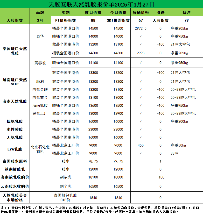 每吨降价100元!天然乳胶现货价格(2026.04.27)