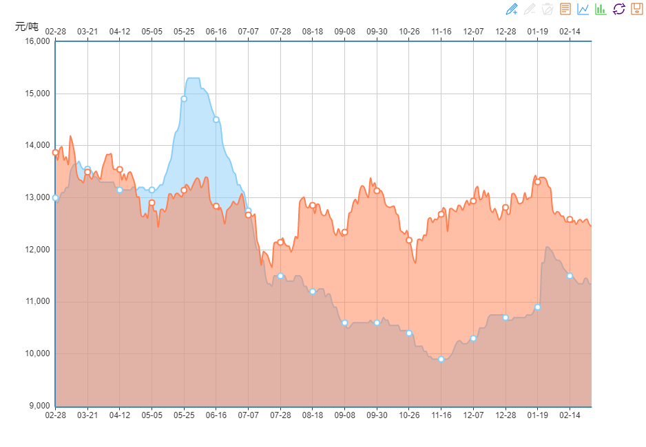 但进入2月后,价格不断下跌,从高位时候的12000元/吨左右,直接跌至目前的11400元/吨附近,跌幅超过500元/吨,压缩了贸易商的利润。