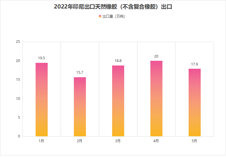 2022年5月,印尼出口天然橡胶(不含复合橡胶)出口17.9万吨。2022年1-5月,印尼出口天然橡胶(不含复合橡胶)合计为91.9万吨,同比降11%。