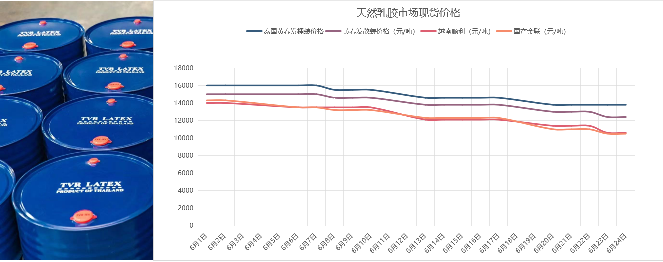 截止到2022年6月24日(周五)泰华THR桶装13700元/吨,黄春发桶装13800元/吨;泰华THR散装(太空包)12900元/吨,黄春发散装(太空包)13000元/吨。越南进口乳胶报价10600/吨,国产乳胶10500元/吨。