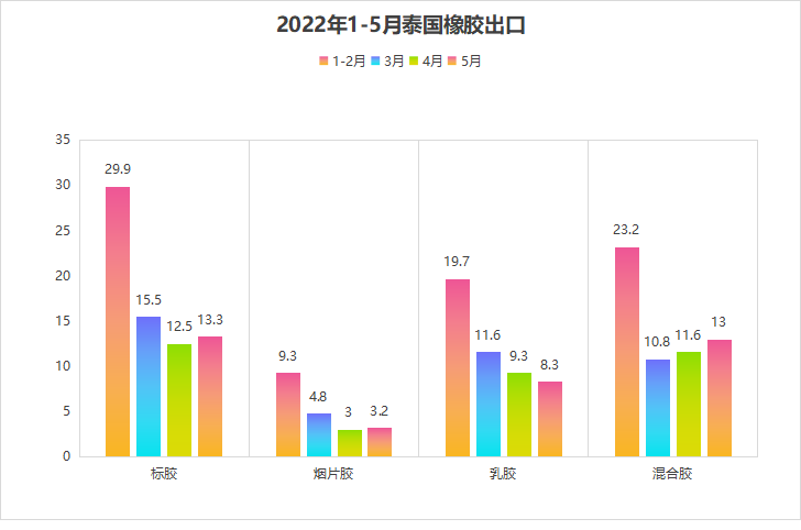 2022年5月,泰国出口混合胶为13万吨。1-5月,泰国出口混合胶合计为58.6万吨,同比增11%。混合胶出口到中国为13万吨,1-5月合计为58万吨,同比增10%。