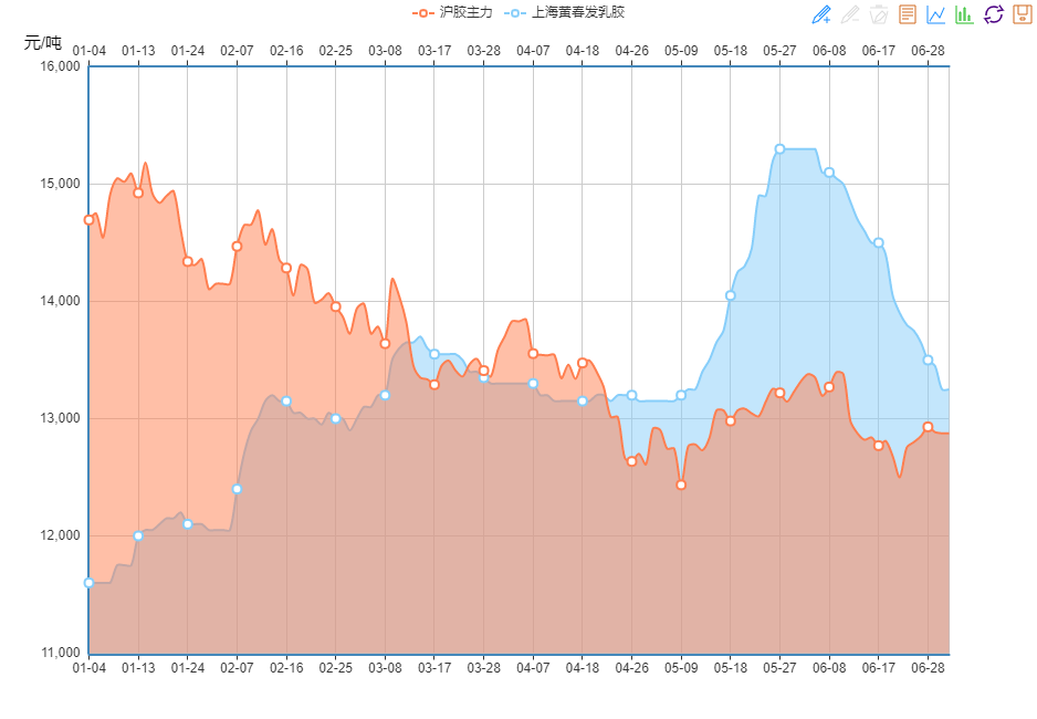 与此同时,国内供应缓解。海南部分加工厂从云南调运胶水原料完成加工继而交货。海南6月份开割明显增长,海南胶水原料收购价下跌反映出了胶水供应的缓解。价格开始下跌,跌幅高达3000元/吨,以至于6月份上演了暴涨暴跌的局面。