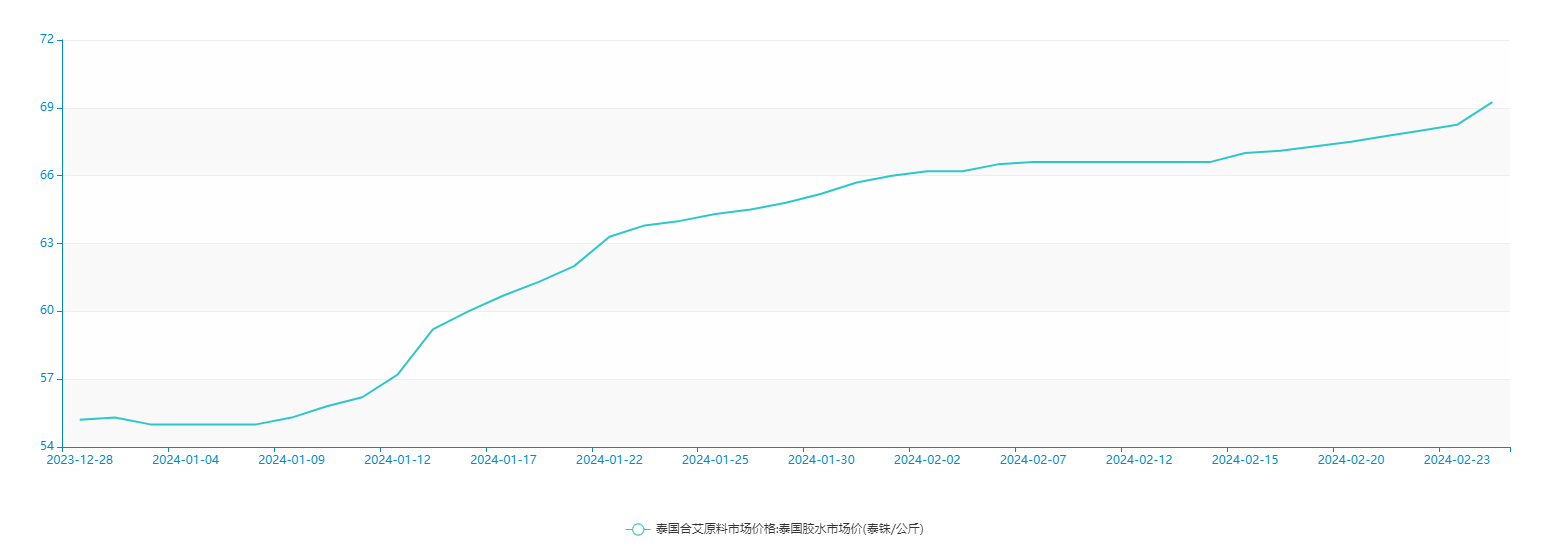 橡胶期货依旧在14000下方震荡,目前暂未突破14000,天然乳胶现货报价偏强:泰华THR桶装13800元/吨,黄春发桶装13900元/吨;泰华THR散装(太空包)12700元/吨,黄春发散装(太空包)12800元/吨。从季节性来看,泰国一般是每年的2-3月份属于停割周期,新胶供给将下降至全年低位水平,4月开始陆续开割。也就是说泰国一个完整的割胶周期实际上——每年的4月份至次年的2月份。那么,现在这个时间点,泰国其实已经进入到了一年供应的低位期,而1-2月份的产能实际上对接下来3、4月份的价格走势至关重要。目前泰国2024年1月份的出口数据已经发布,2024年1月泰国天然乳胶出口量6万吨,同比下降27%。也就是说1月份泰国产能并没有增长,而2月份料想也不会又什么增长,因为胶水原料价格在这。2024年元旦开始至2月28日,泰国胶水原料价格一直处于上涨态势。1月2日是53.5泰铢/公斤,2月1日是66泰铢/公斤,目前是69.25泰铢/公斤。也就是说今年开始至今,胶水原料价格涨了15.75泰铢/公斤,涨幅29.4%。2月开始至今,胶水原料价格涨了3.25泰铢/公斤,涨幅4.9%。1月份的涨幅较大,不过2月份是在1月份高位的基础上继续上涨。从胶水原料价格的持续上涨,我们可以推断出——2月份泰国胶水供应并没有显著增长。供应平稳——出口量也不会增长。这就决定了接下来3、4月份的市场基本面,而3月份泰国处于停割周期,胶水原料价格可能还会上浮,即将70泰铢/公斤整数关口,预计将在一周内。至于突破70泰铢/公斤之后,还有多少空间,目前还需要观察。泰国胶水原料价格处于高位的情况下,天然乳胶成本高企,美金市场价格也必然维持高位,国内天然乳胶价格可能会持续高位震荡。当然,我们还需要看3月份国内下游的需求情况,节后下游需求的复苏关系到天然乳胶价格的高度。因为供应已经将价格推到了一定的高度,接下来就是下游乳胶制品工厂的需求了,购买力了。- 如果购买力旺盛,那么,天然乳胶还存在一定上涨空间;