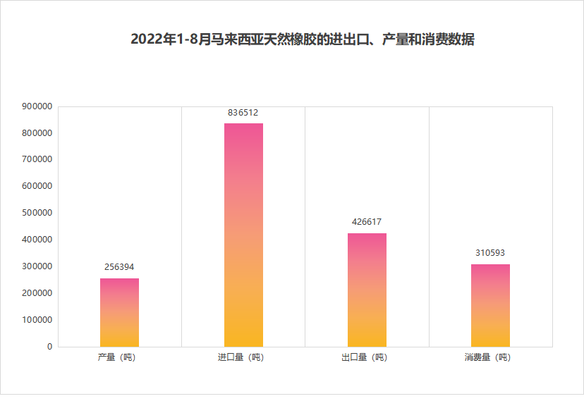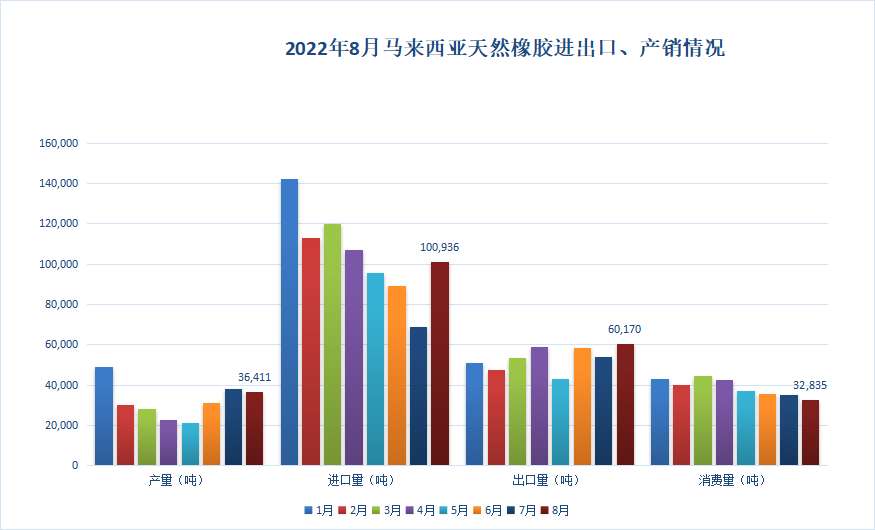 8月马来西亚天然橡胶进口量为100,936吨,同比增26.6%,环比增55.5%。标准胶、浓缩乳胶、其他形状天然橡胶为主要进口类别,其主要进口来源国为泰国、科特迪瓦、菲律宾、缅甸等。